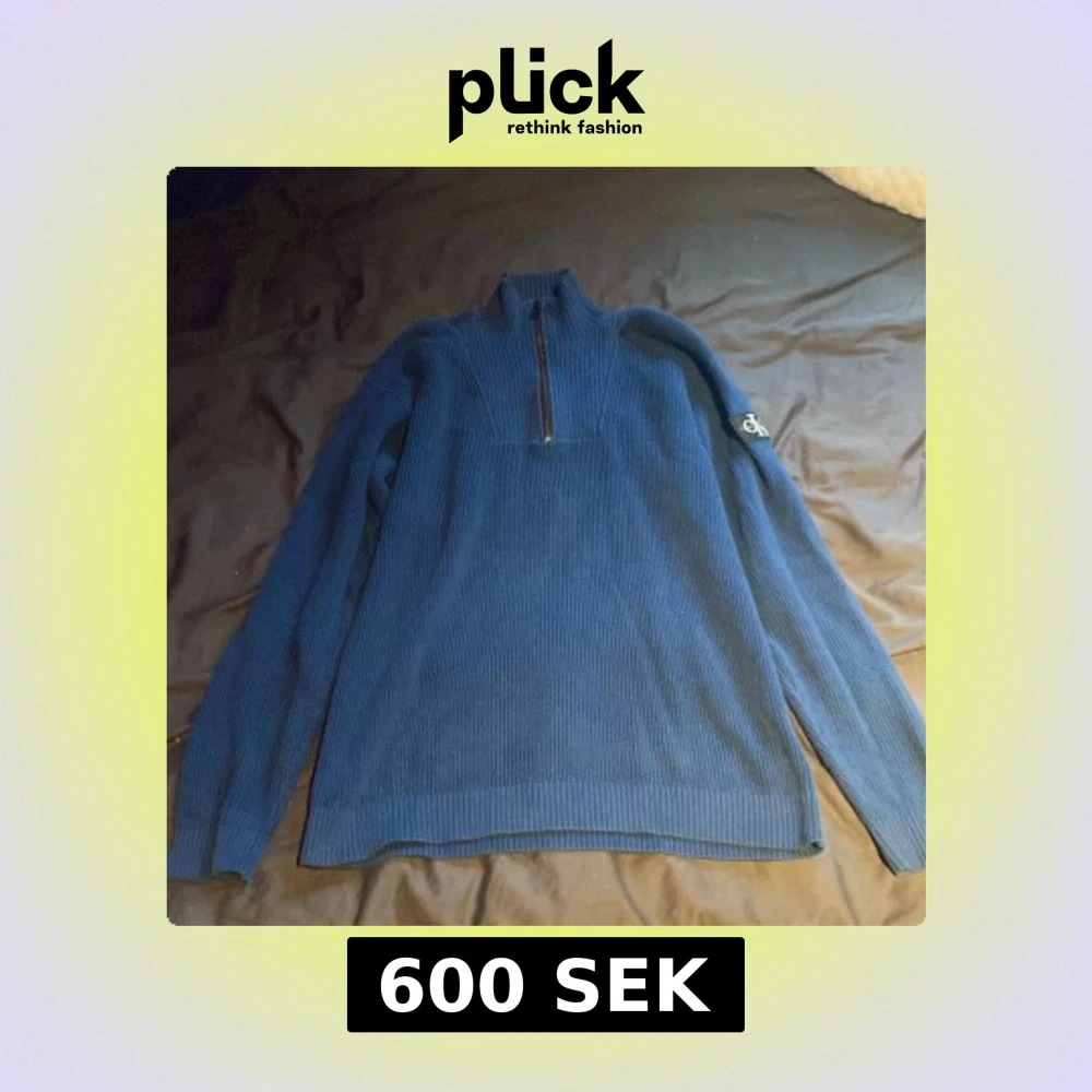 Säljer en blå stickad tröja från Calvin Klein Jeans med ribbad struktur och half zip-dragkedja framtill. Tröjan har hög krage och lång ärm, samt en snygg CK-logga på ärmen. Perfekt för dig som gillar stilrena och klassiska plagg.