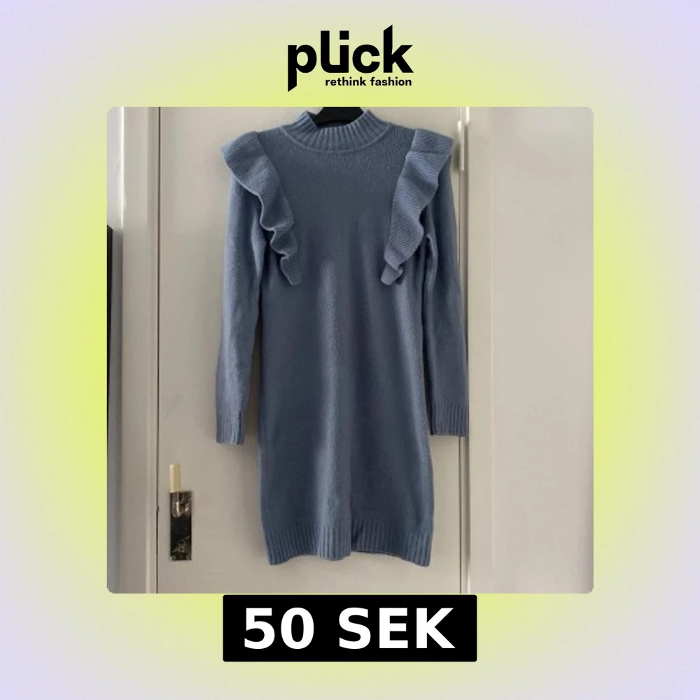 Supersöt ljusblå stickad klänning med långa ärmar och volangdetaljer på axlarna. Hög ribbad hals och ribbade muddar ger en mysig känsla. Perfekt för dig som gillar en feminin och trendig look.