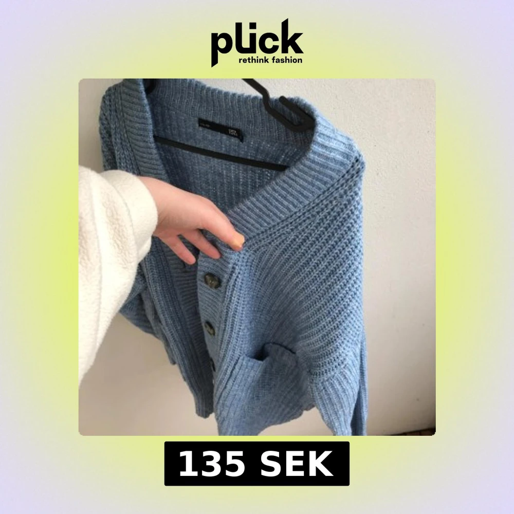 Fin blå stickad kofta grov ribbstickning, stora knappar framtill och två fickor. Den är oversize modell jätte fin, men kommer ej till användning. Den är s men eftersom den är oversize så passar den ju S till L