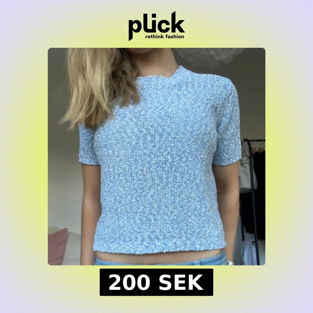 Säljer en ljusblå stickad topp med korta ärmar. Perfekt för en avslappnad stil. Toppen har en enkel och stilren design som passar till många olika outfits. Stl M men passar mer som S
