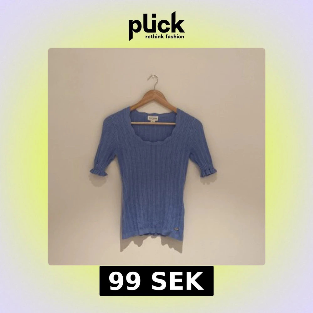 Supersöt ljusblå stickad topp från Holly & Whyte med ribbat mönster, rundad urringning och korta ärmar med volangkant. 💕😍Perfekt för vår och sommar, passar till både jeans och kjol. ☀️Materialet är mjukt och stretchigt. Storlek S. Kommer i jätte bra skick!💙🤍
