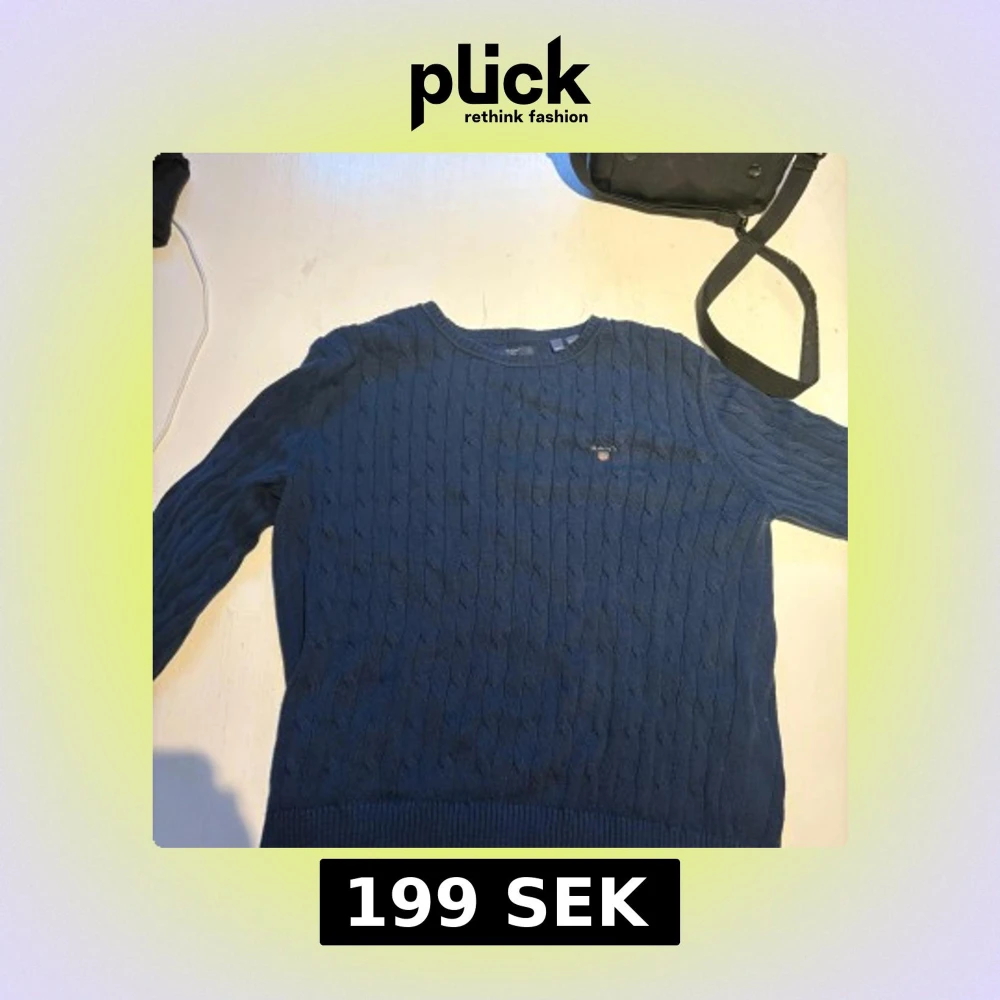 Säljer en snygg blå stickad tröja från GANT. Tröjan har ett klassiskt flätmönster och rund halsringning. Bra skick använd då gånger!