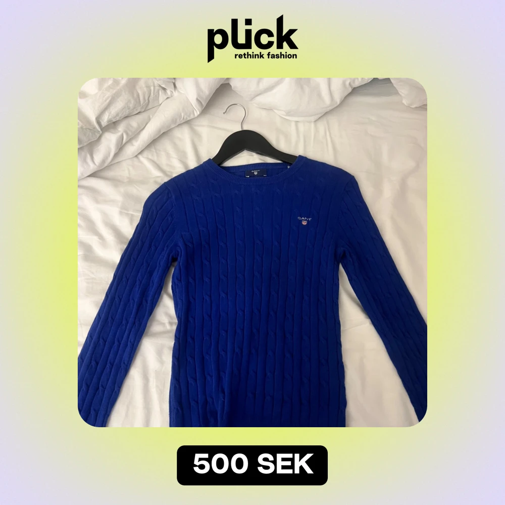 Säljer en snygg blå stickad tröja från Gant. Den har ett klassiskt flätmönster och är perfekt för både höst och vinter. Tröjan är långärmad och har en normal passform. Perfekt för att hålla sig varm och stilren! 💙