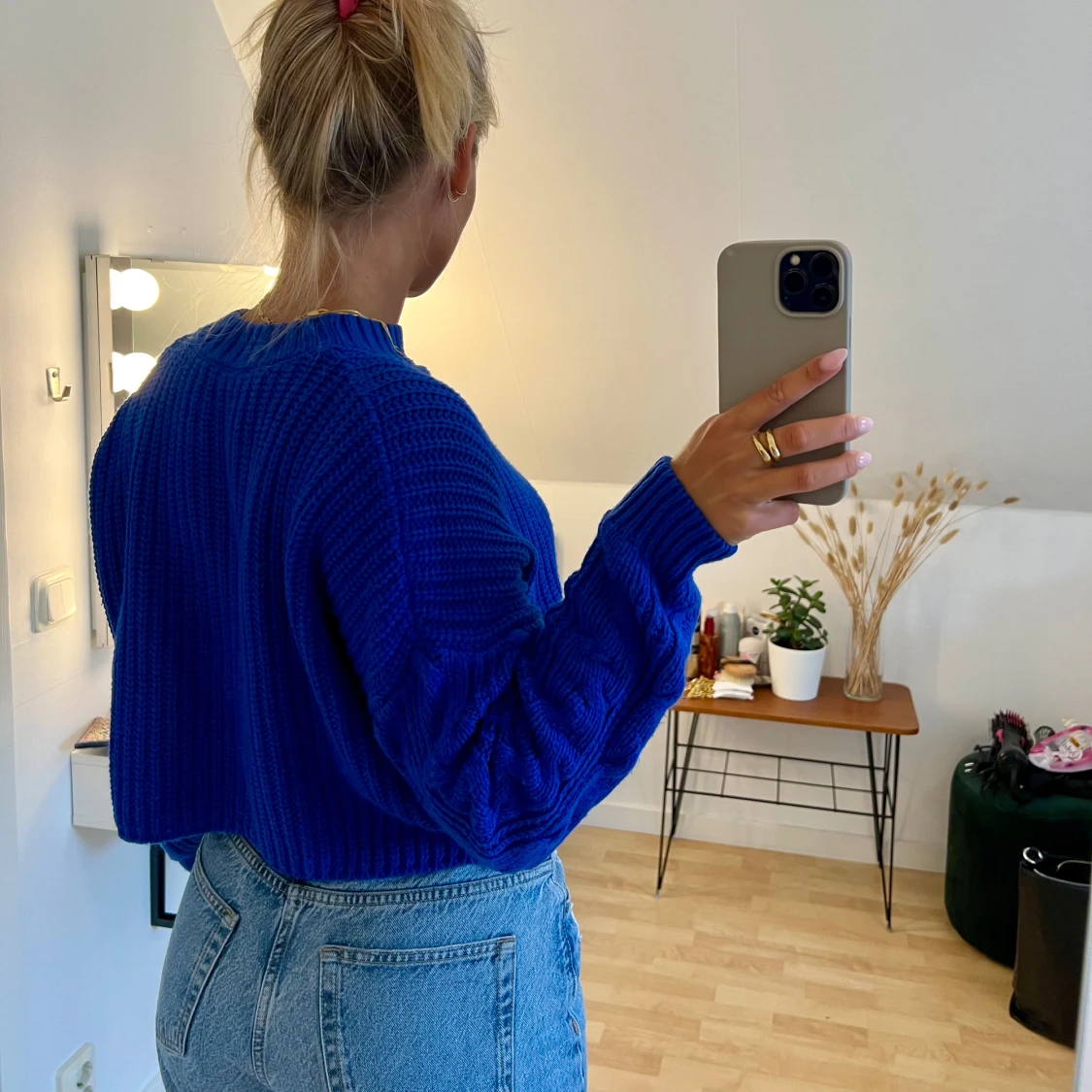 Supersnygg blå stickad tröja, något croppad i modellen. Storlek S, passar XS-M🦋 Är 167 cm lång och vanlig S-M.