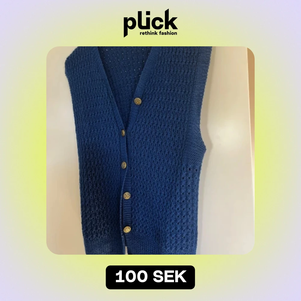 Säljer en snygg blå stickad väst med fina guldknappar. Västen har en v-ringad design och ett härligt stickat mönster som ger den en unik look. Perfekt för höst och vår, och kan stylas både uppklätt och avslappnat. Passar bra för både vardag och fest!