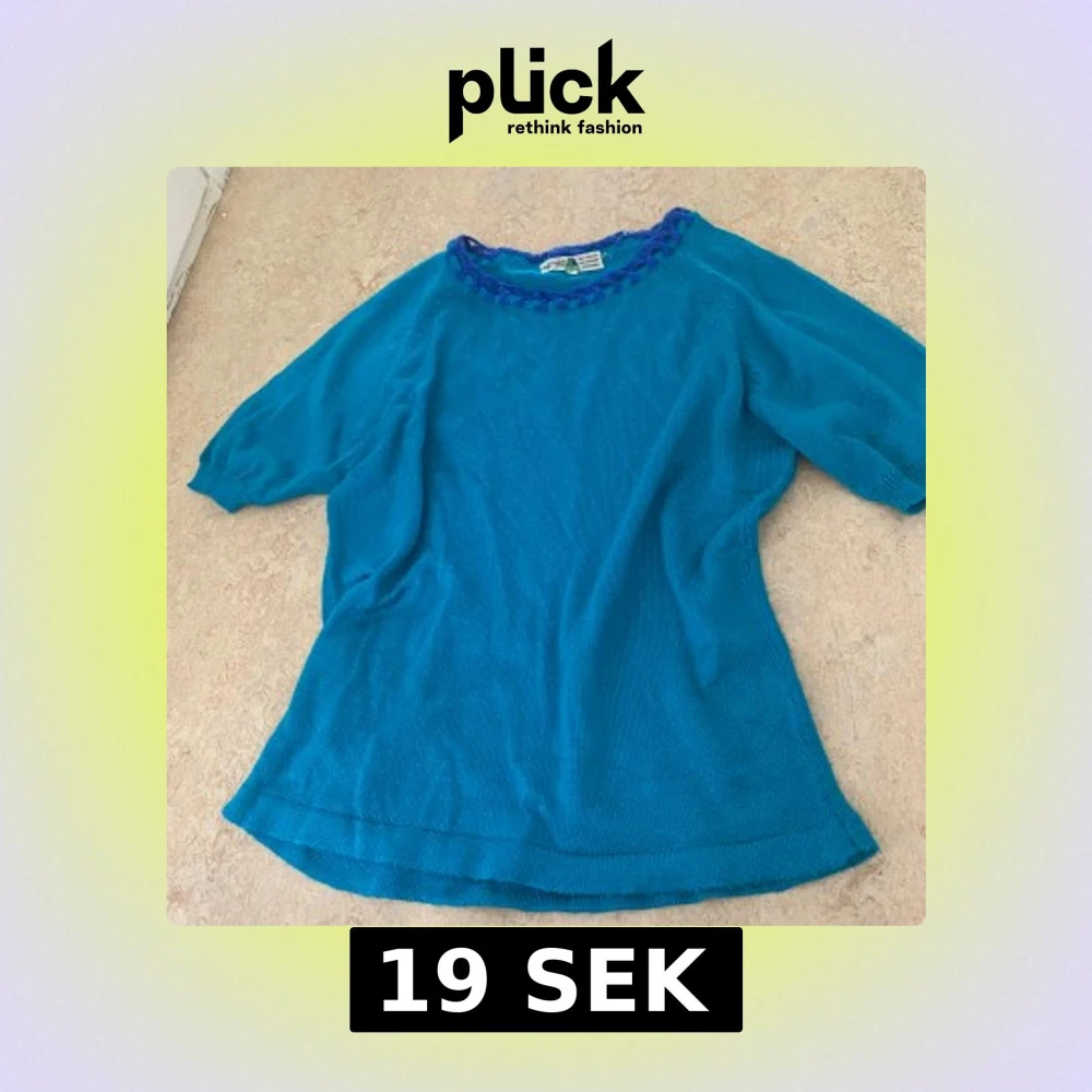 Säljer en turkos stickad tröja från Leacril med halvkort ärm och dekorativ blå virkad kant runt halsen. Tröjan har en avslappnad passform och är tillverkad i 100% akryl. Tröjan nästan glänser i verkligheten, väldigt cool!