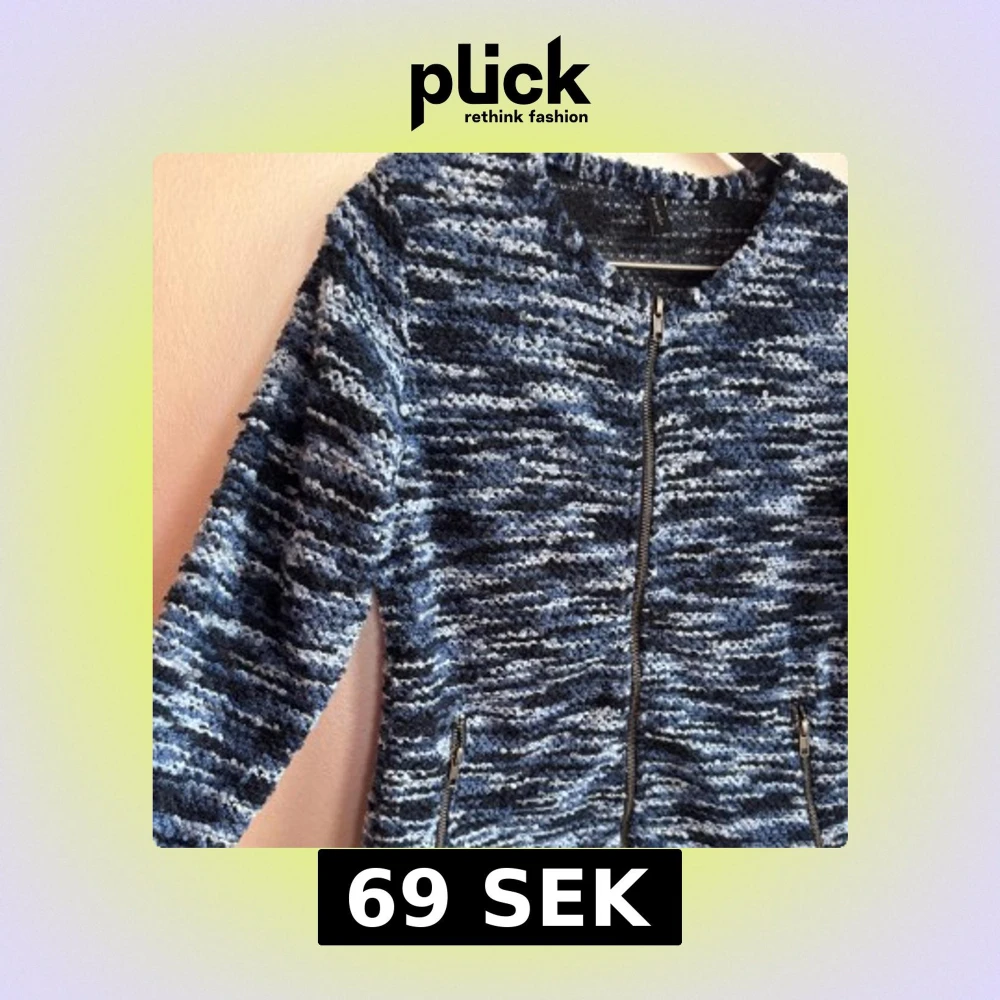 Säljer en blåmönstrad kavaj med grov stickad struktur och dragkedja framtill. Jackan har ett coolt mönster, rund hals och två fickor med dragkedja. Perfekt för dig som gillar att vara fin och samtidigt bekväm.