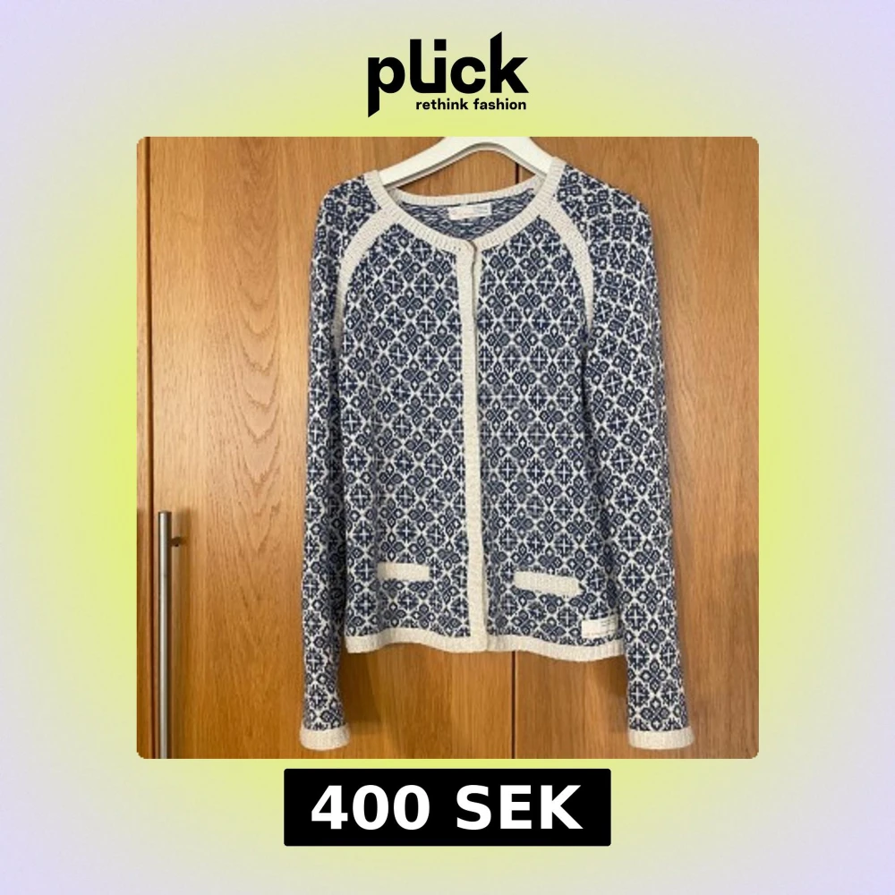 Säljer en blåvit stickad kofta från Odd Molly med snyggt geometriskt mönster. Koftan har långa ärmar, rund hals och ribbade kanter. Perfekt att slänga på sig för en chill och stilren look.