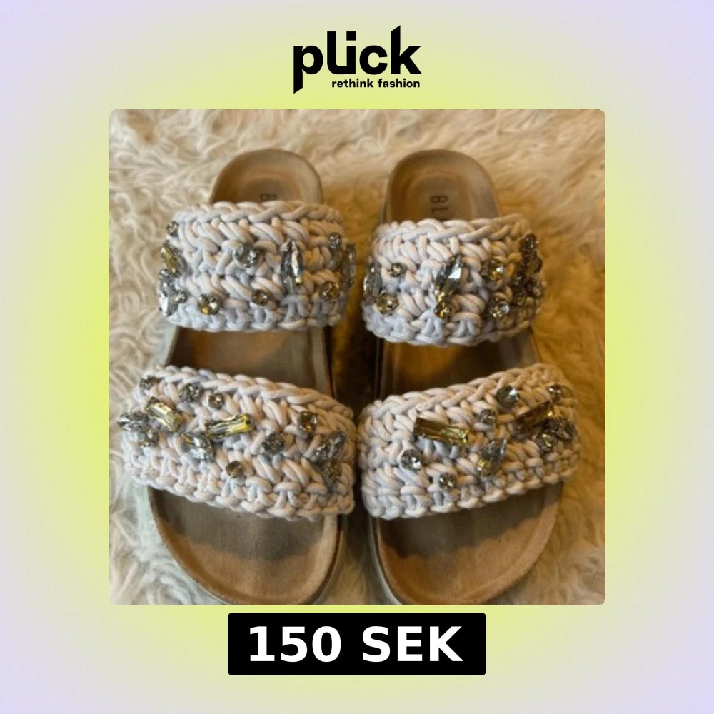Unika sandaler i beige med två breda stickade band dekorerade med glittrande pärlor och stenar. Snygg platåsula i kork och vit räfflad undersida. Perfekta för dig som vill sticka ut med en bohemisk och trendig vibe.