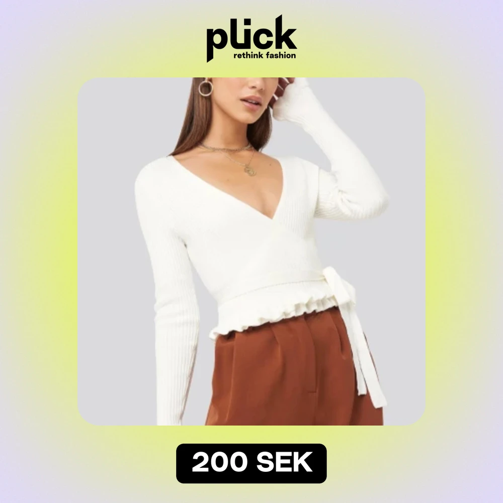 Blusen har en omvirad design med ett knytbart band vid midjan, en v-ringning, långa ärmar med en fransig detalj i nederkant och en mjuk stickning. Naturvit färg. Går inte längre att köpa. Inga skador eller skavanker. Använd endast 1 gång.