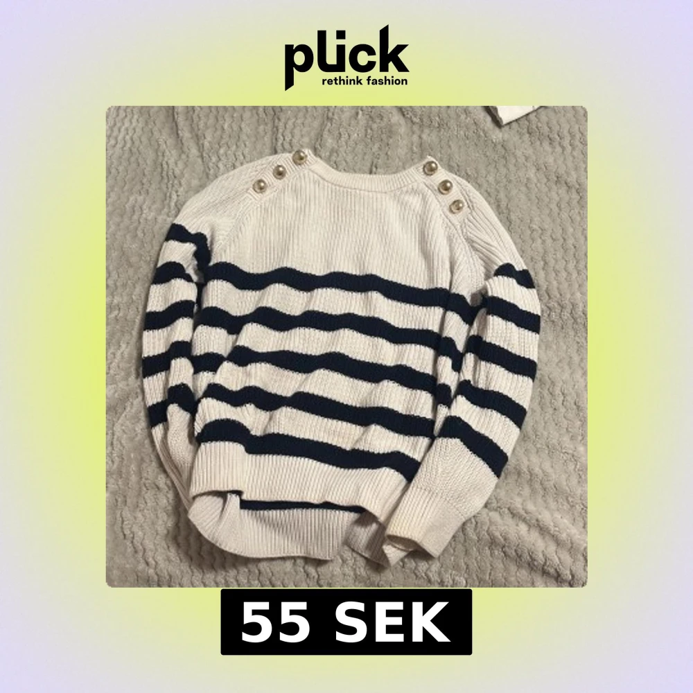 Säljer en mysig tröja med marinblå och vita ränder. Tröjan har dekorativa knappar på axlarna och långa ärmar. 100% Bomull. Lite använd. Storlek S. Hör av dig för eventuella frågor 🌸kolla gärna in mina andra annonser!⤵️✨