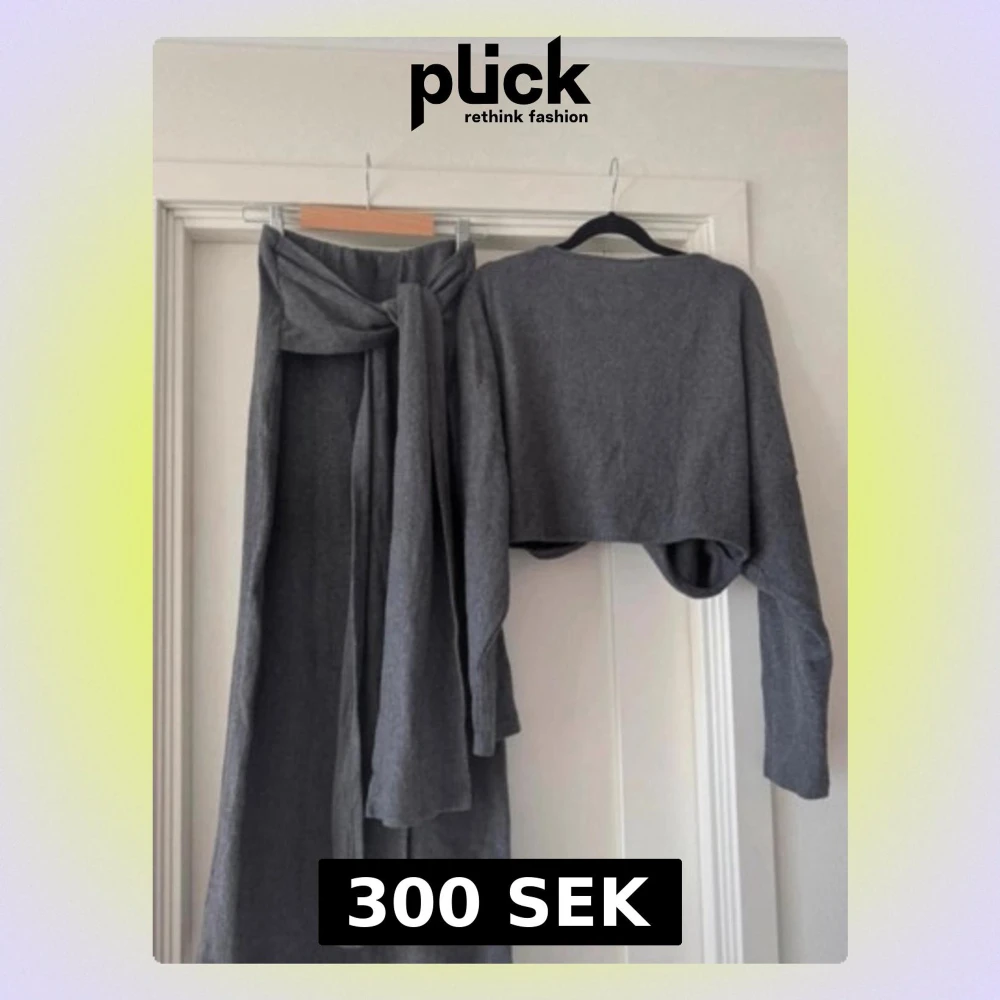 Säljer en grå croppad omlottkofta från Boohoo med lång ärm och loose passform. Koftan har en snygg omlottdetalj framtill och är tillverkad i mjukt stickat material. Tillkommer en stickad kjol