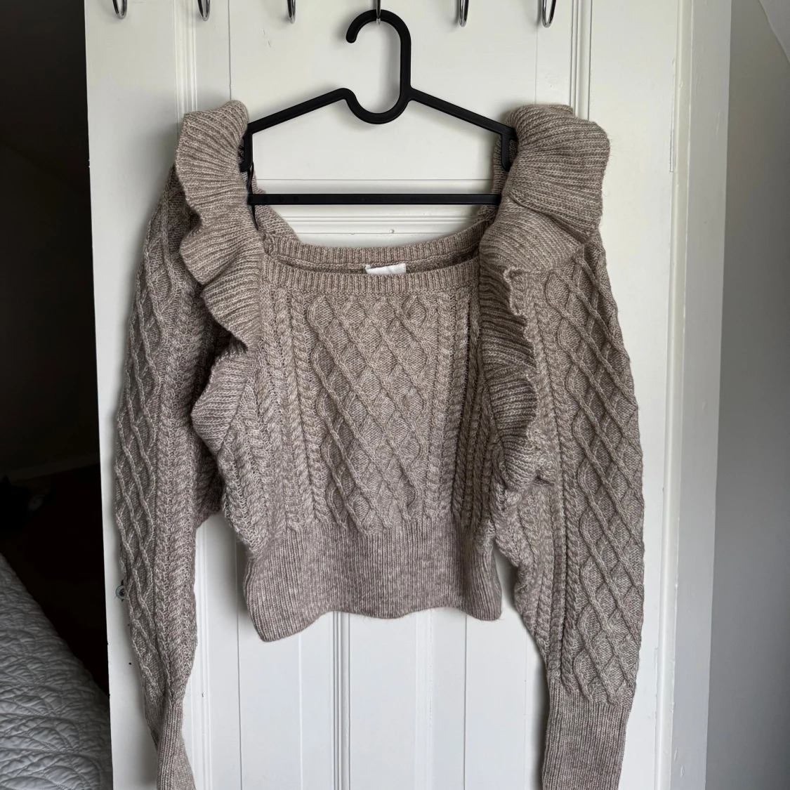 Superfin beige stickad tröja från H&M i storlek XS. Tröjan har ett snyggt kabelstickat mönster, långa ärmar och coola volangdetaljer längs axlarna. Perfekt för dig som gillar en söt men trendig look. Aldrig använd