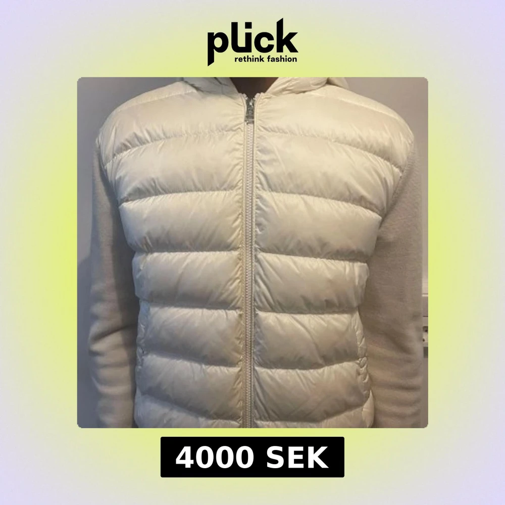 Säljer en stilren vit pufferjacka från Moncler med huva och dragkedja framtill. Jackan har quiltade partier på framsidan och släta stickade ärmar med Moncler-logga och röd/blå rand på ärmen. Perfekt för dig som gillar exklusiv streetwear. (Även öppen för byten)