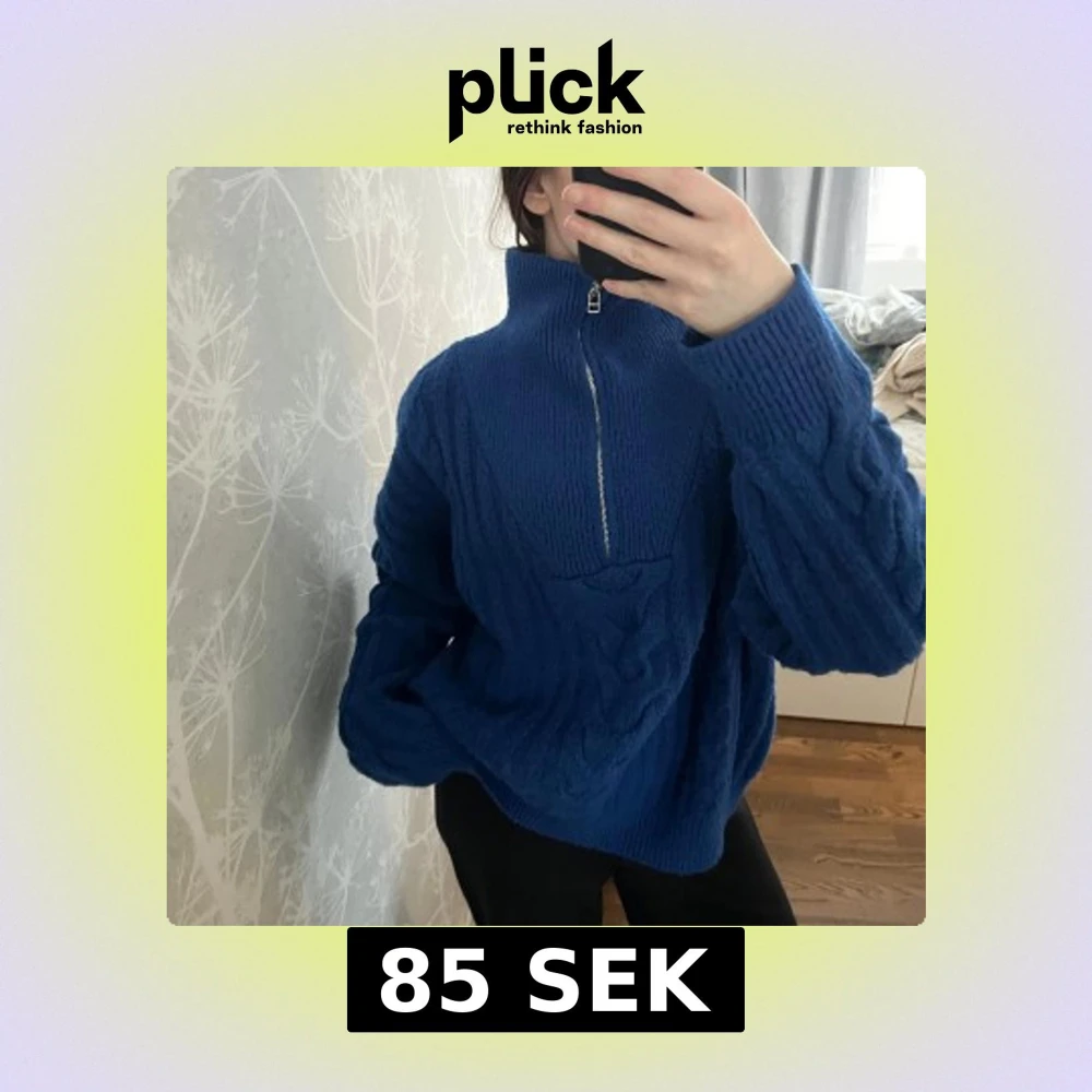 Säljer en mysig blå stickad tröja med hög krage och dragkedja framtill. Tröjan har ett snyggt flätmönster och långa ärmar. Den är väldigt varm, så perfekt för kyliga dagar☺️