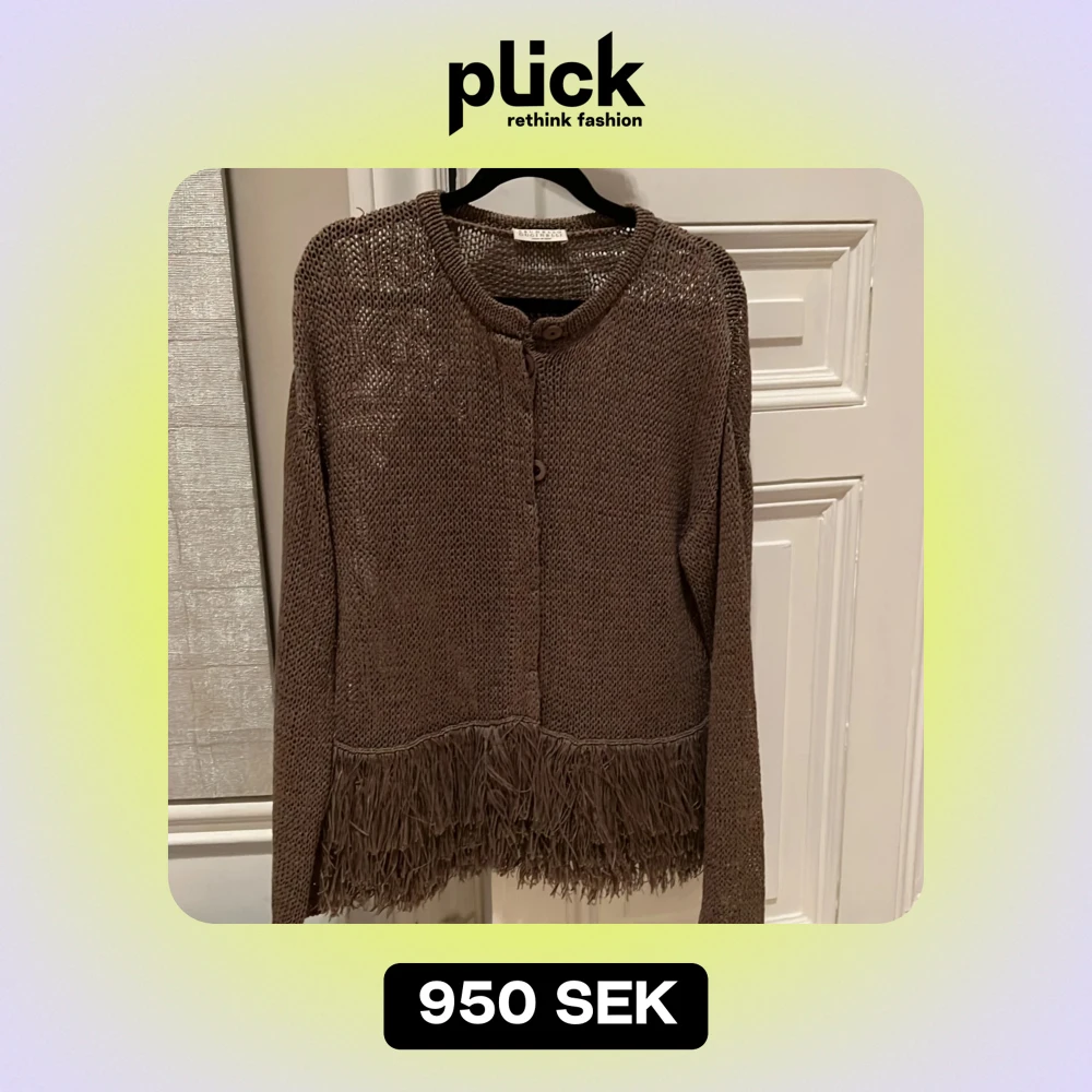 Säljer en superfin brun stickad kofta från Brunello Cucinelli. Den har långa ärmar och en unik fransdetalj längst ner som ger den en bohemisk elegant touch.