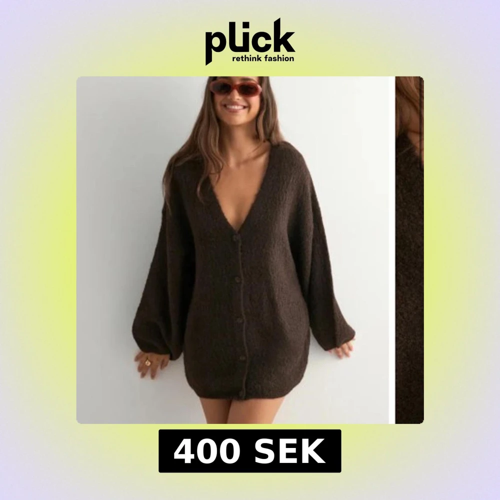 Helt ny med prislapp. Mysig brun kofta från Nelly med volym i ärmarna och djup v-ringning. Koftan är stickad, har knappar framtill och en loose passform som ger en chill vibe. Perfekt att slänga på sig över ett linne eller t-shirt.