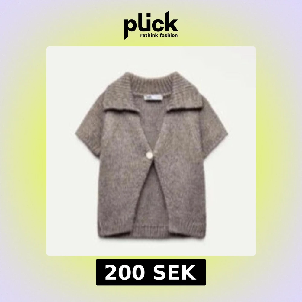 Säljer en brun stickad kofta med korta ärmar och en stor krage. Koftan har en knapp framtill och är perfekt att slänga över en t-shirt eller linne. Enkel och stilren design som passar till mycket.