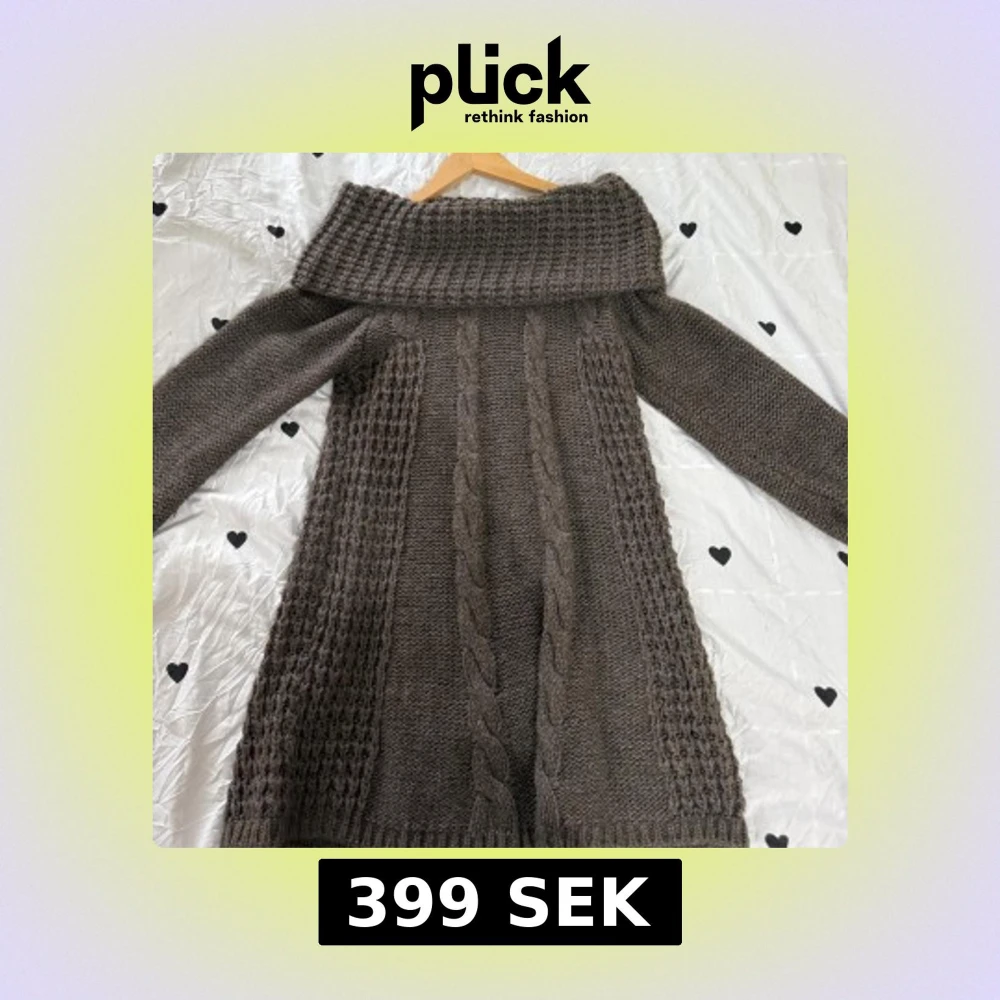 Mysig brun stickad långklänning med bred krage och kabelstickade detaljer framtill. Klänningen har långa ärmar och ett chunky, strukturerat mönster som ger en cool och avslappnad vibe. Perfekt för kyliga dagar och att styla med boots.