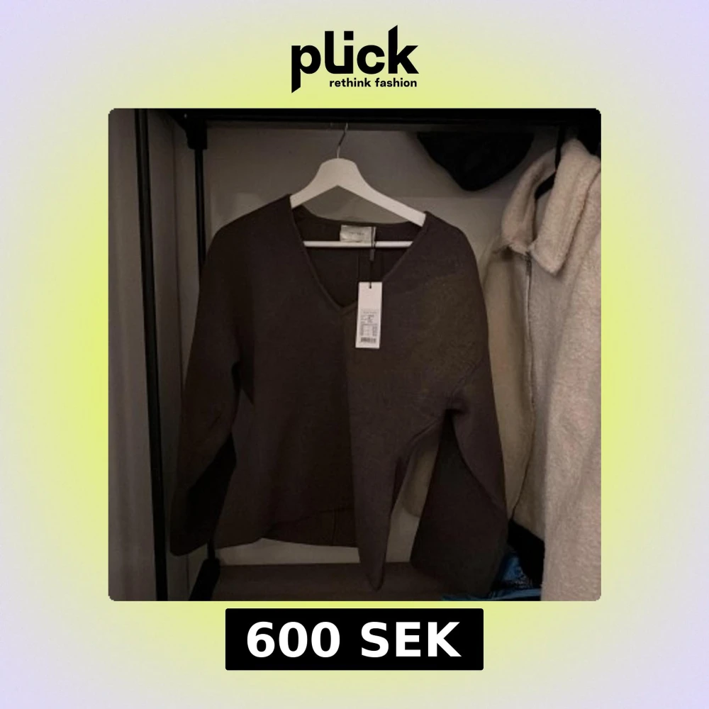 Säljer en brun stickad tröja från Neo Noir med v-ringning och figursydd. Tröjan har långa och breda ärmar och är perfekt för kyligare dagar. Den är både stilren och bekväm.
