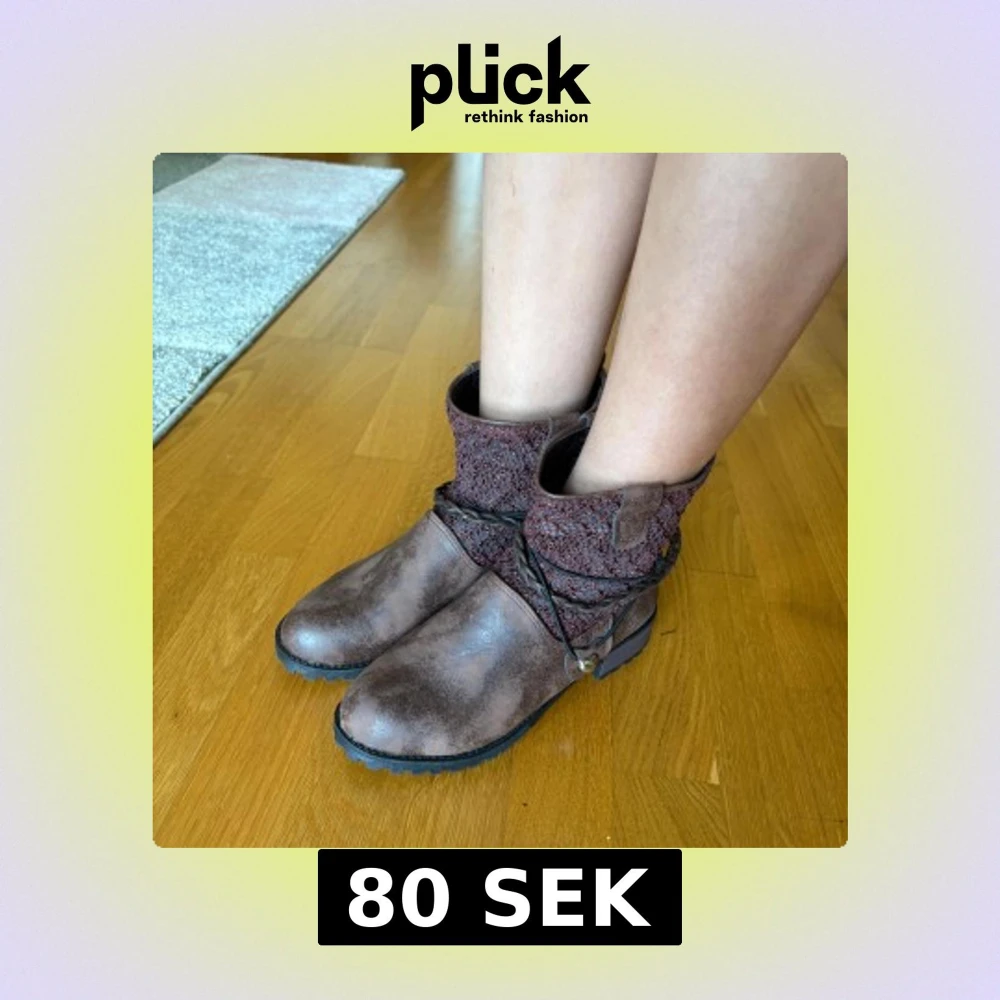 Snygga bruna boots med grov sula och stickad mudd upptill i vinröd ton. Skorna har dekorativa flätade remmar runt skaftet och en liten metallberlock. Perfekta för höst och vinter med sin robusta look och coola detaljer.