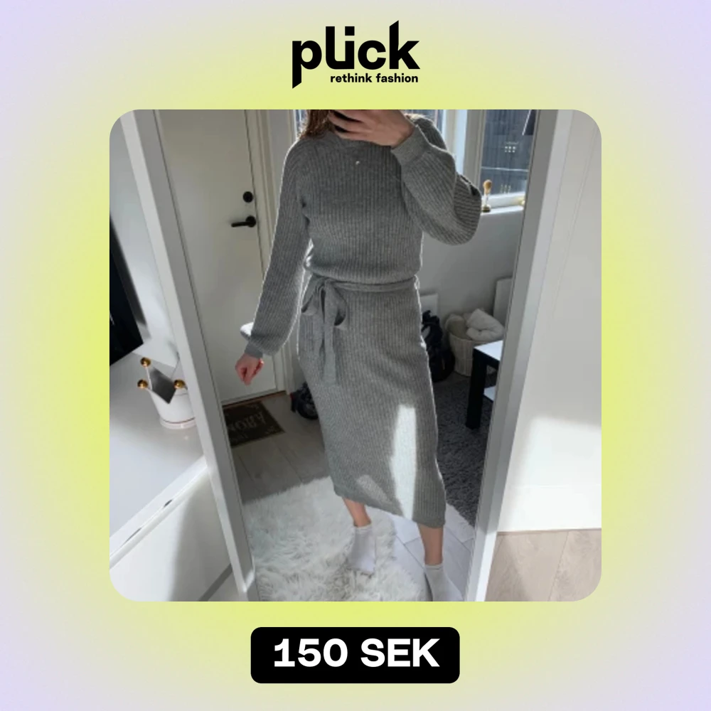 En grå stickad klänning från bubbleroom med knyte i midjan och en slits bak.