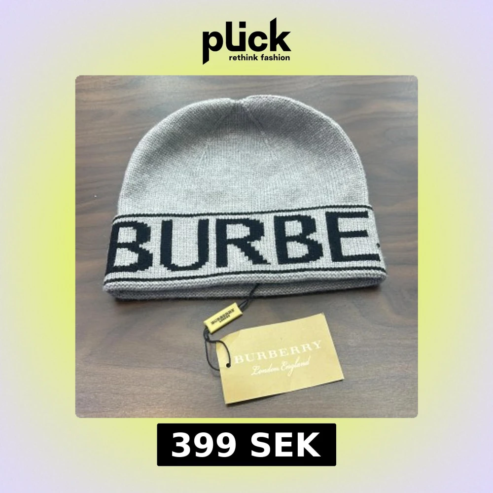 Snygg grå mössa från Burberry med bred svart logotyp runt kanten. Stickad i mjukt material som håller dig varm och ger en clean look. Perfekt för dig som vill ha en stilren accessoar med lyxig känsla och tydlig branding.