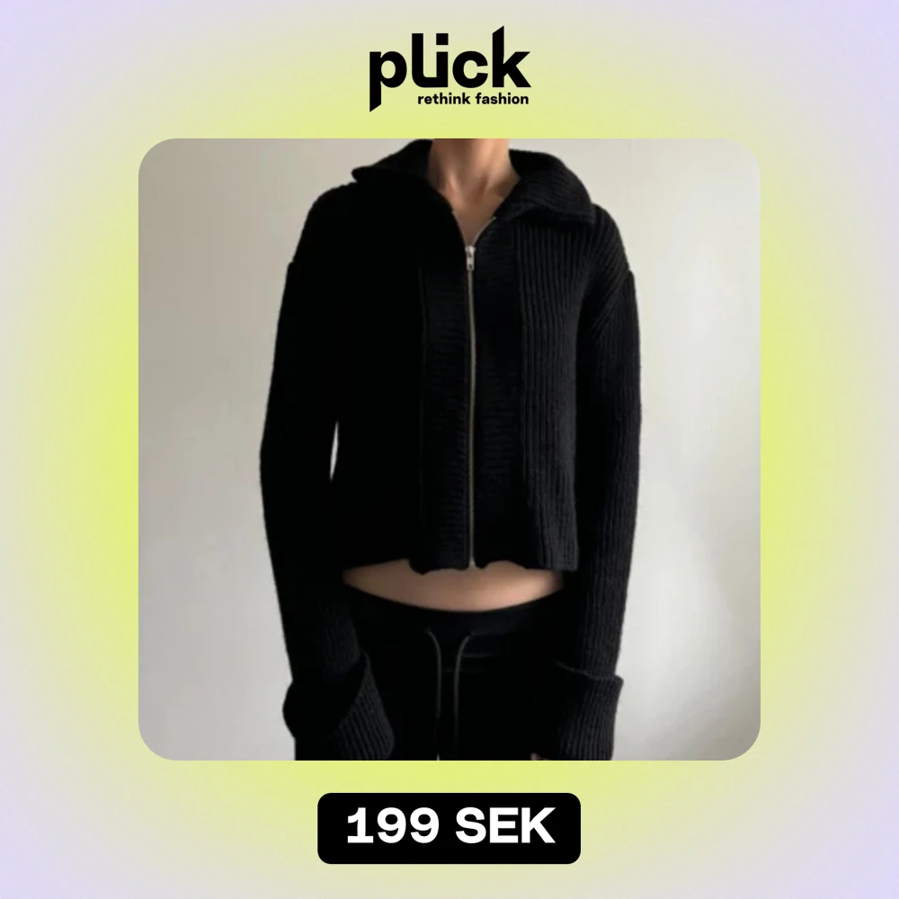 Cardigan/kofta med dragkedja. Stickad, men sticks absolut inte.
