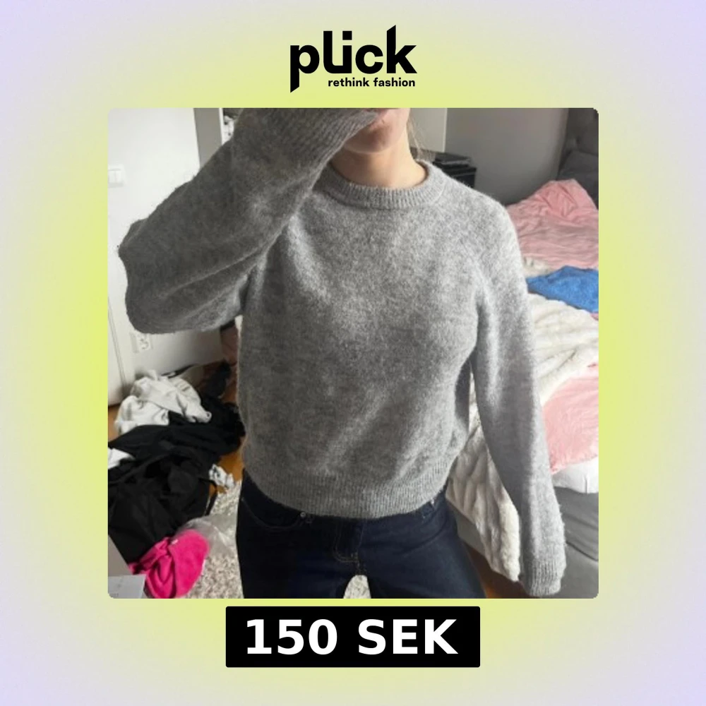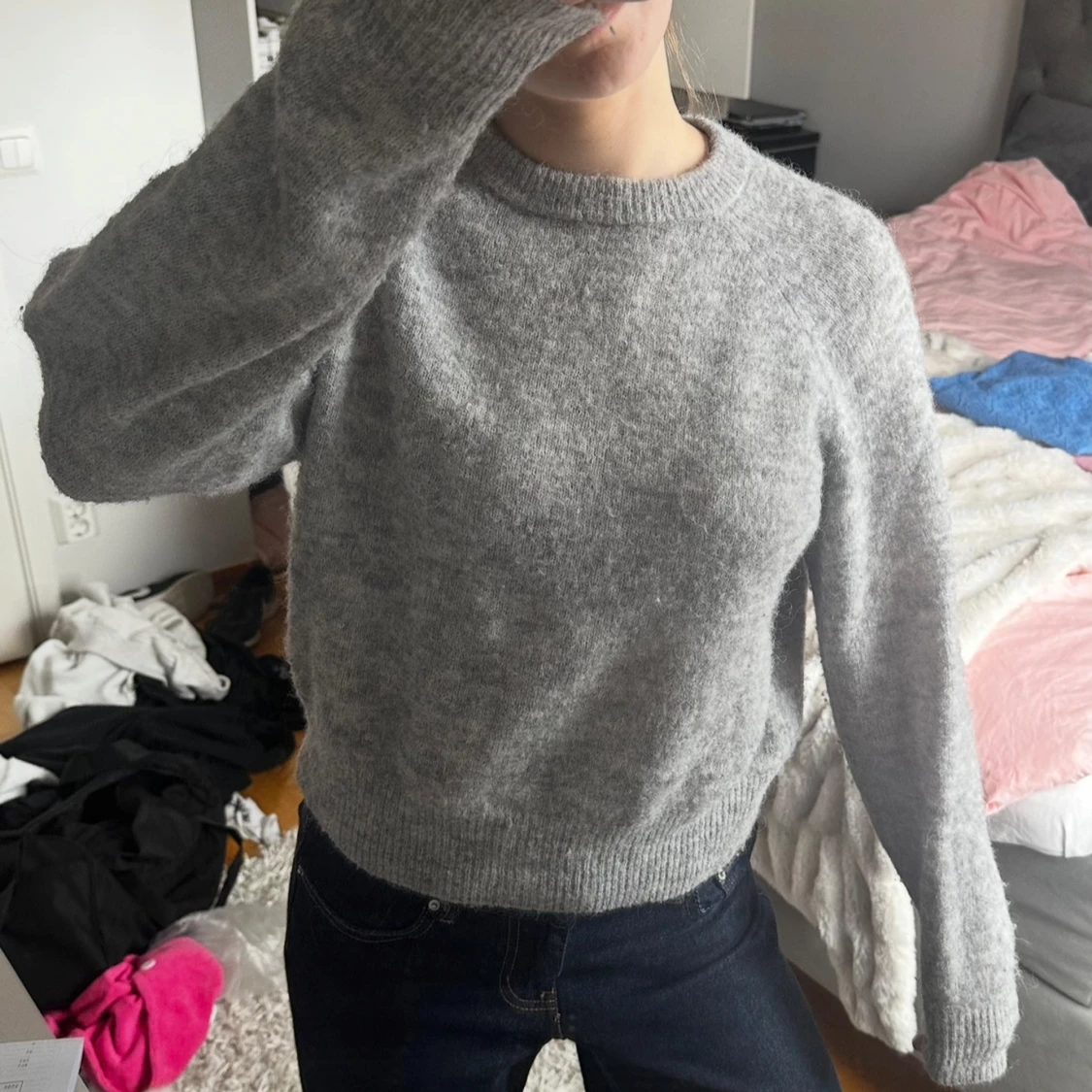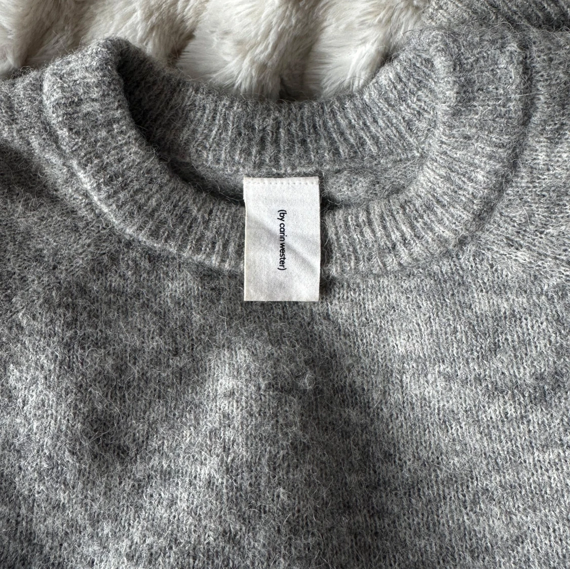 Mysig grå stickad tröja från Carin Wester med rund halsringning och ribbade muddar. Str XXS men jag har S i vanliga fall och de där är så den sitter på mig. Så skulle absolut säga att den passar både XXS, XS och S beroende på vad för passform man vill ha.