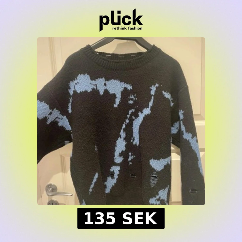 Cool svart stickad tröja med abstrakt blått mönster. Tröjan har en avslappnad passform, rund halsringning och långa ärmar. Perfekt för dig som gillar en unik och edgy stil.