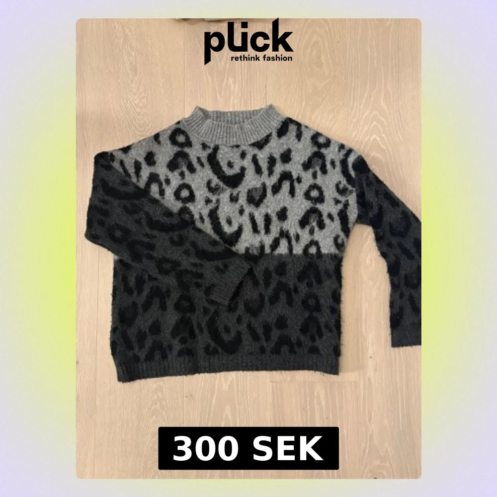 Snygg stickad tröja från Mango i grått och svart med leopardmönster. Tröjan har ribbad hög hals och långa ärmar.