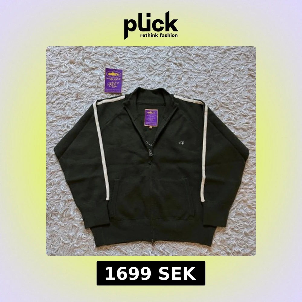 Helt ny, oanvänd, med originaletiketter kvar. Detta är inte en vanlig track top utan det är en exklusiv stickad zip-up från det hypade London-märket Corteiz. Plagget är tillverkat i en extremt mjuk och kraftig stickad kvalitet som är perfekt för vintern. Den djupa skogsgröna färgen är diskret och stilren, medan de ikoniska vita ränderna längs axlarna och den broderade 'C'-logotypen på bröstet ger den rätt attityd. Baksidan pryds av en stor, broderad "Corteiz" script-logotyp. Sällsynt find!