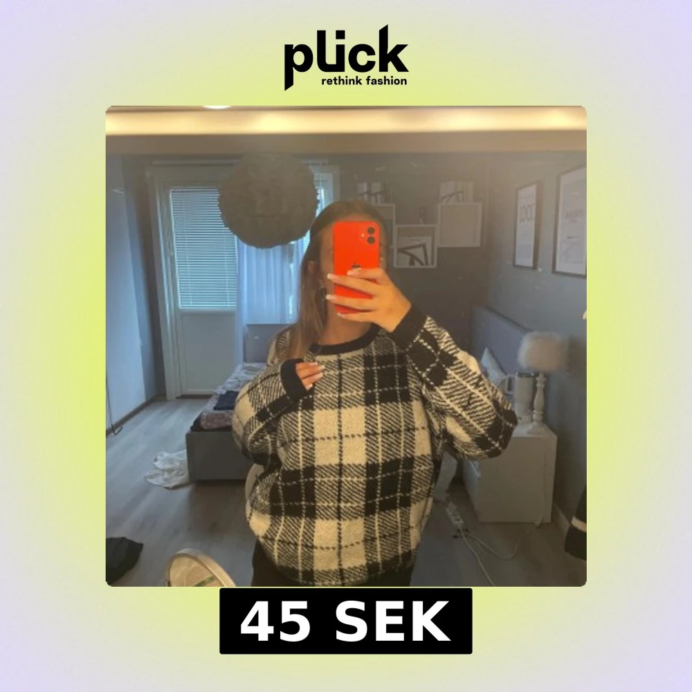 Säljer en stickad tröja från H&M i svart och vitt med rutigt mönster. Tröjan har långa ärmar och ribbade muddar vid halsen. Perfekt för dig som gillar en chill och trendig stil. Inga defekter, men använd💗