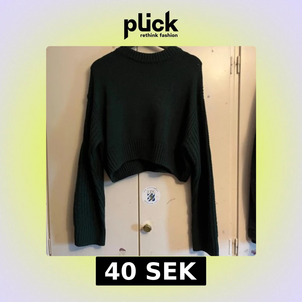 Säljer en snygg mörkgrön stickad tröja från Divided. Tröjan är croppad med långa ärmar och har en ribbad design. Passar bra till jeans eller kjol för en avslappnad look. Köpte på HM för ca 1,5 år sedan men har aldrig använt