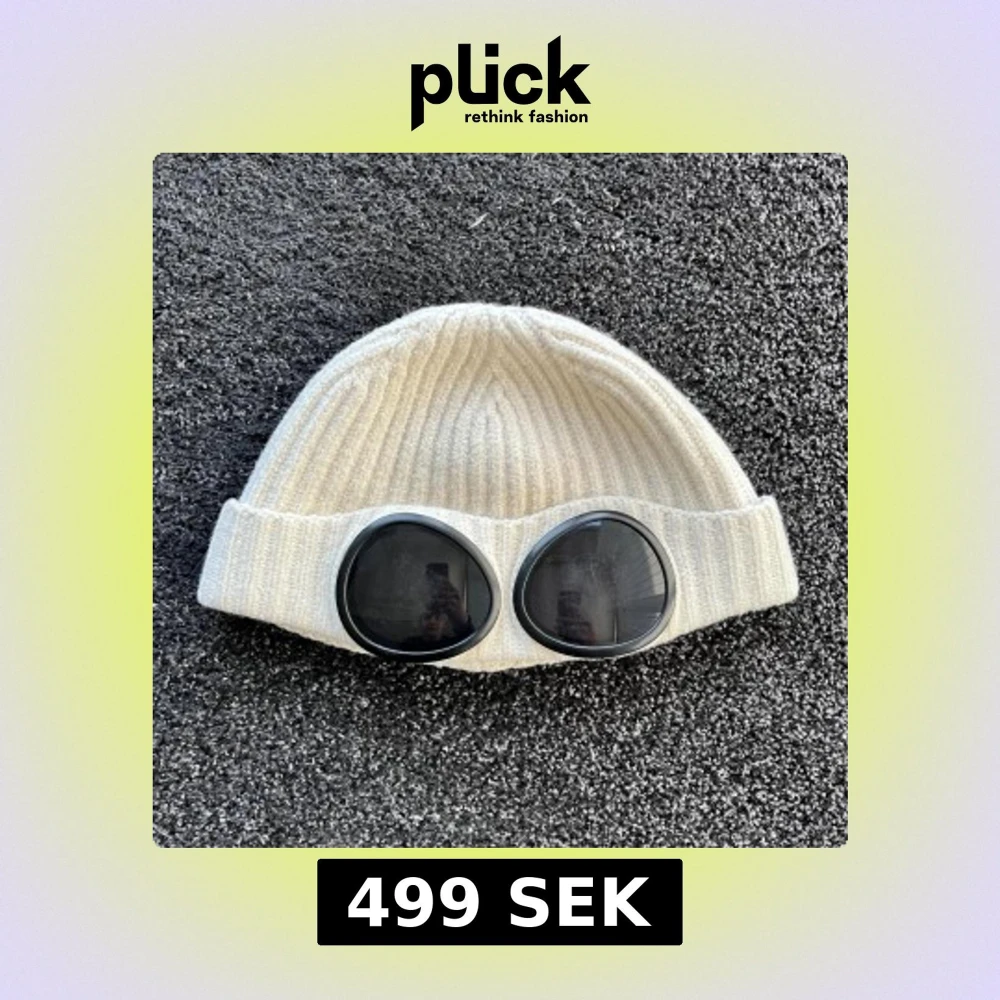 Säljer en vit ribbstickad mössa från C.P. Company med ikoniska svarta goggles framtill. Mössan är tillverkad i mjuk ull och har en bred uppvikt kant. Skick 9/10, qr kod finns. Pris går att diskutera✅