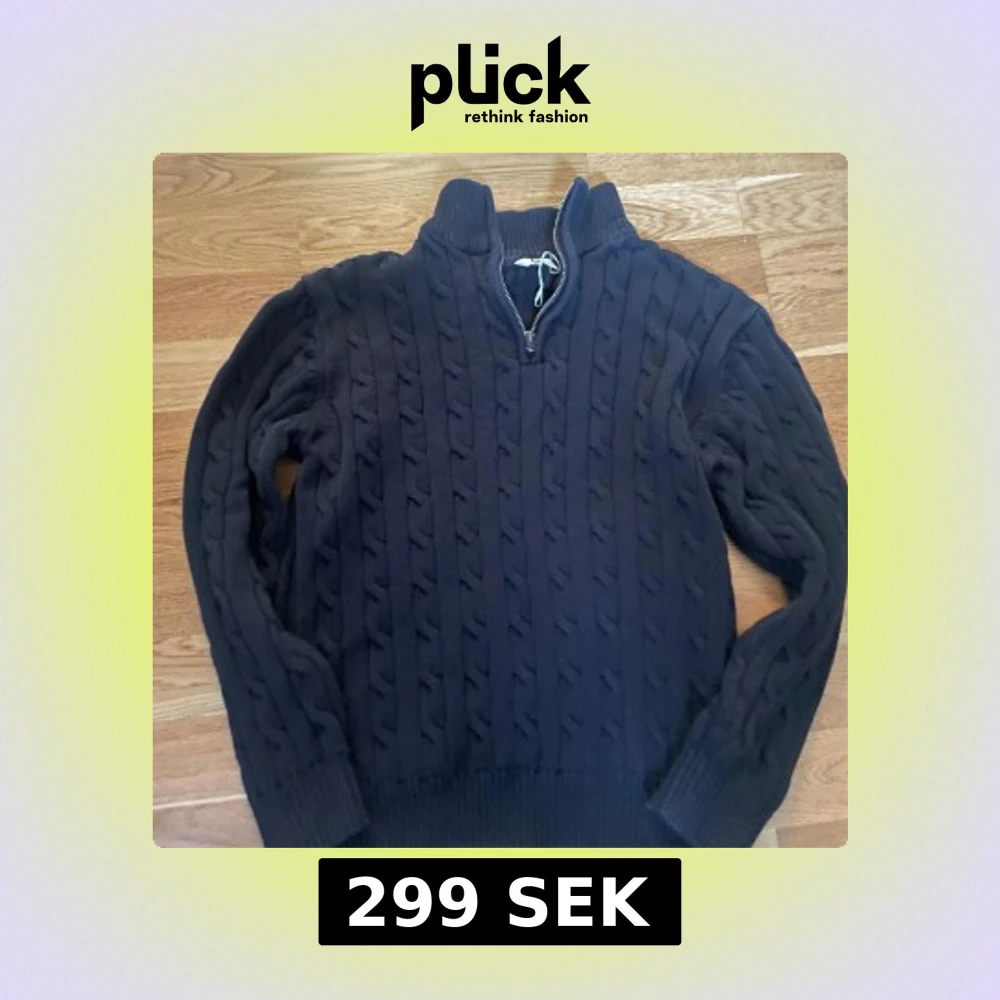 Mörkblå kabelstickad tröja från C med hög krage och half zip-dragkedja. Tröjan har långa ärmar och ribbade muddar, perfekt för kyliga dagar. Snygg och klassisk look som funkar till det mesta. Storlek 13-14 158-164 krympt ej 170