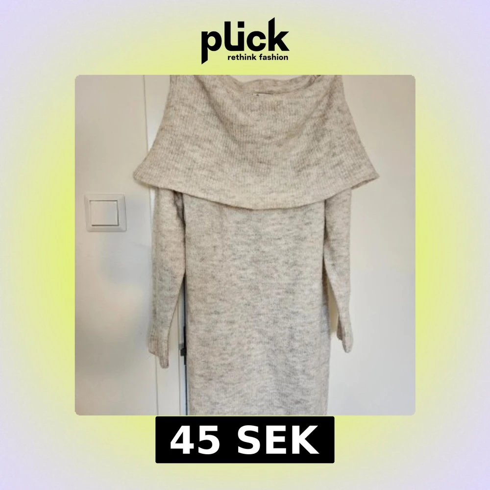 Mysig cremefärgad/ljust beige stickad klänning från Cubus med bred krage som kan bäras offshoulder. Långärmad och rak modell i mjukt och härligt material.