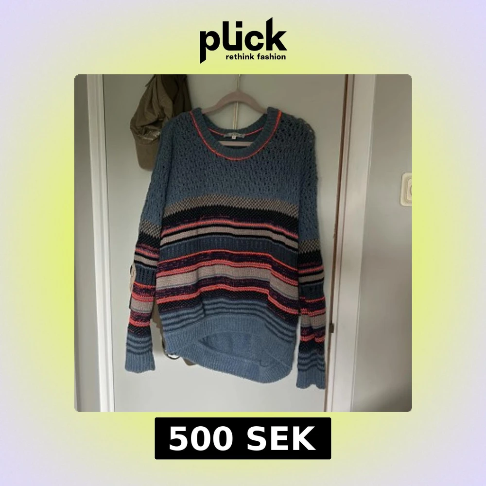 Säljer en oversized stickad tröja från Dagmar i blått med randigt mönster i blått, rosa och grått. Tröjan har lång ärm, rund hals och coola virkade detaljer upptill. Perfekt för dig som gillar unika och färgglada plagg.