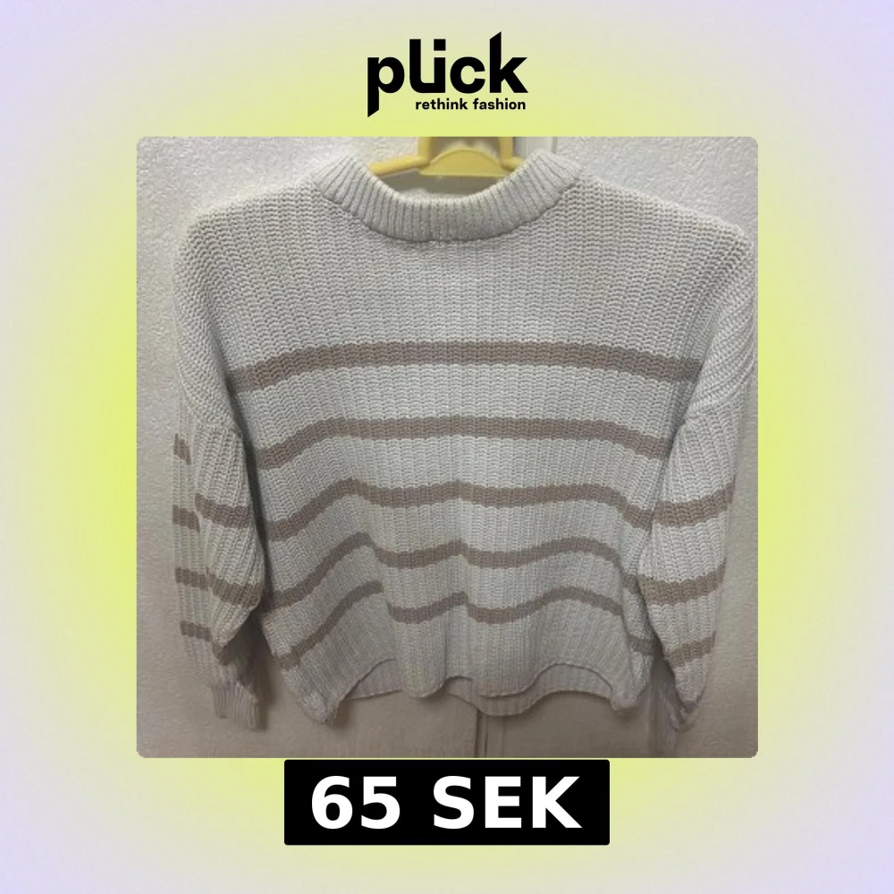 Mysig stickad tröja från lager 157 i beige och vitt med horisontella ränder. Tröjan har en rund halsringning och långa ärmar. Perfekt för kyligare dagar och enkel att matcha med jeans eller kjol.