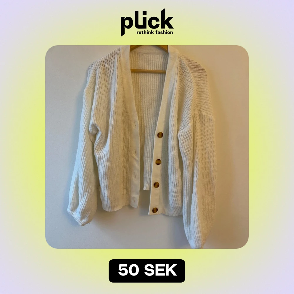 Mysig vit stickad kofta med stora träknappar framtill. Perfekt för kyliga dagar, den har en avslappnad passform och långa ärmar. Koftan är i bra skick och passar både till vardags och lite finare tillfällen. Ett måste i garderoben för höst och vinter!