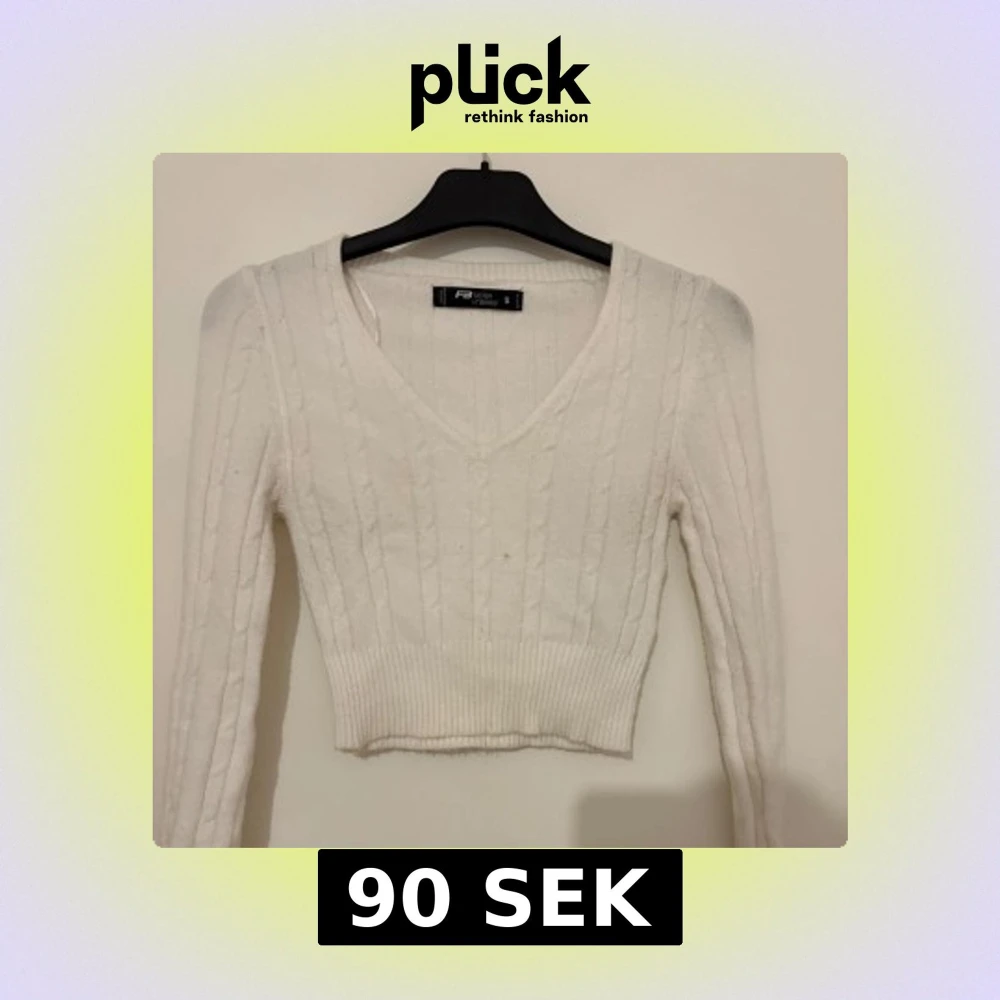 Säljer en vit stickad croppad tröja från FB Sister. Tröjan har v-ringning, lång ärm och ribbad midja.