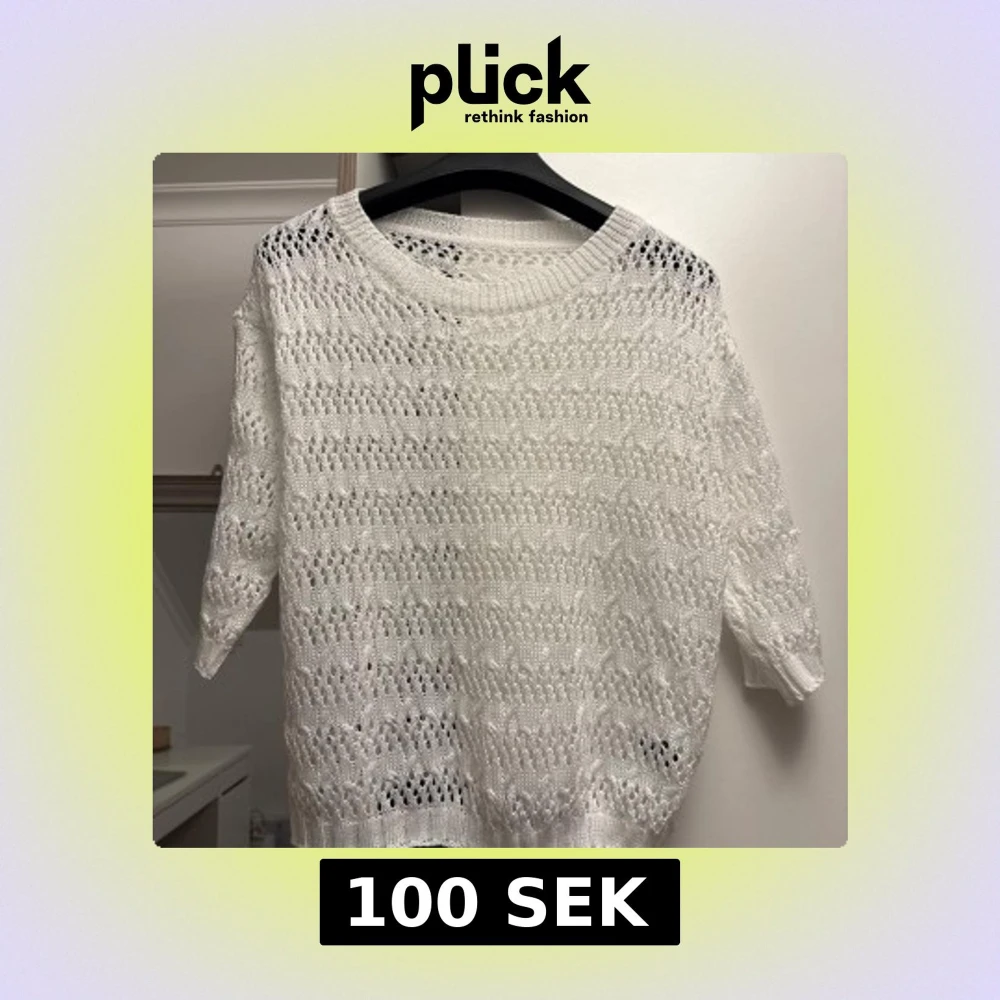 Säljer en vit stickad tröja från SHEIN med ett luftigt, hålmönstrat stickat material. Tröjan har rund halsringning och trekvartsärm. Perfekt för lager-på-lager och ger en fräsch look till din outfit.
