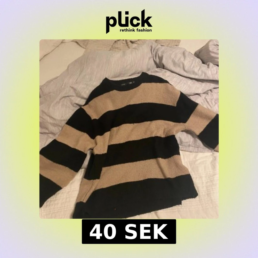 Säljer en stickad tröja från 157 i storlek XS. Tröjan har breda svarta och beige ränder, rund halsringning och långa ärmar. Perfekt för dig som gillar en enkel men snygg stil.