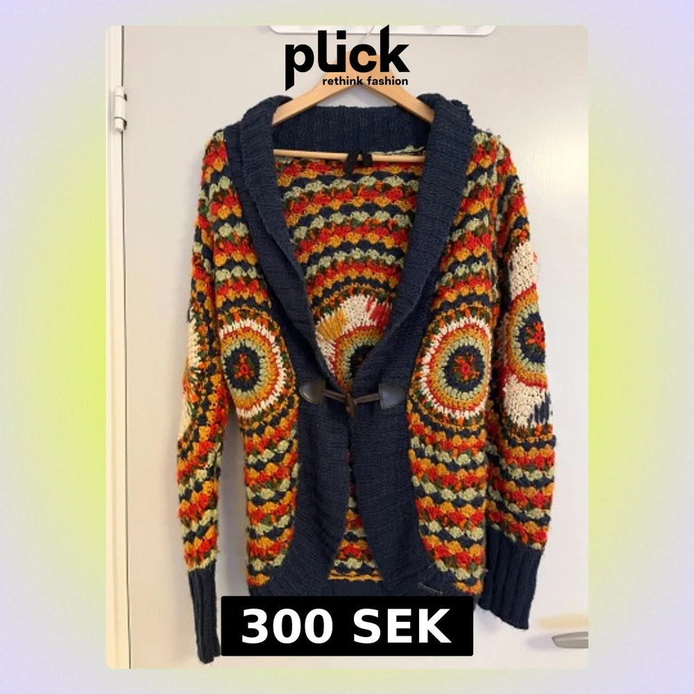 Unik kofta från Desigual med virkade cirkelmönster i marinblått, rött, gult, grönt och vitt. Grovstickad känsla, bred krage och snygg knäppning framtill med träknapp och läderdetaljer. Perfekt statement-plagg för dig som gillar färg och mönster.