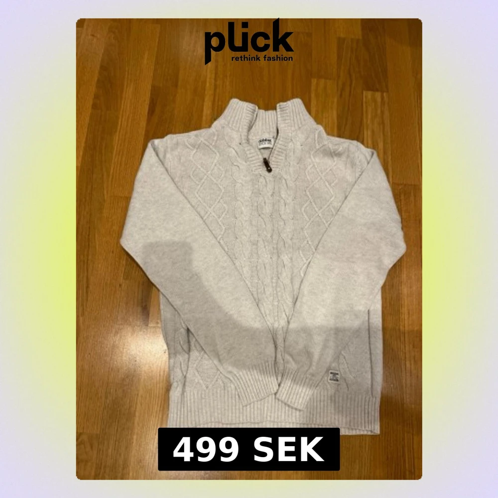 Säljer en ljusgrå stickad tröja från Dobber i storlek medium. Tröjan har kabelstickat mönster framtill, ribbad krage och muddar samt en liten knappdetalj vid halsen. Perfekt för kyliga dagar och enkel att matcha med jeans eller chinos.