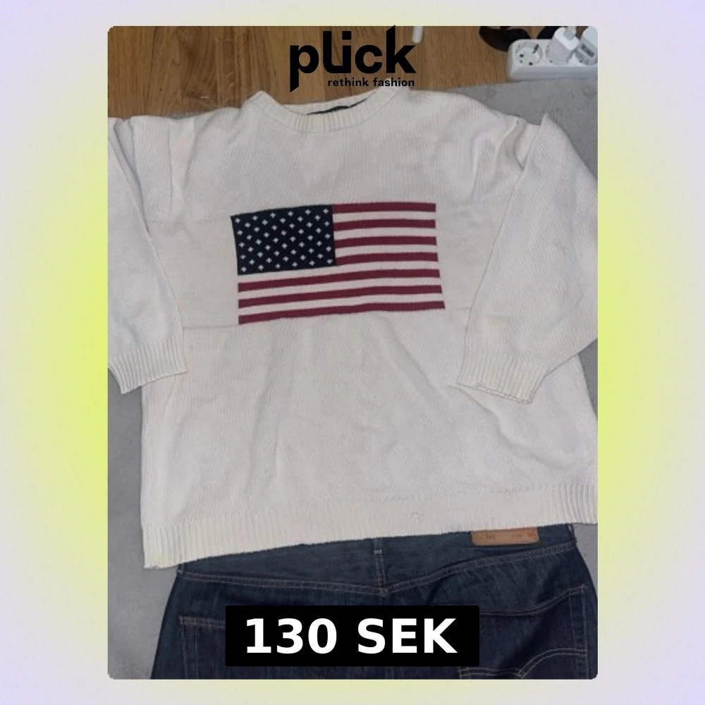 Jag köpte denna tröja här på plick men den var verkligen helt fel storlek står L men sitter mera som en XL eller XXL i armarna skulle passa folk som gillar en mera baggy loose look, Vit stickad tröja från Focus America med stor amerikansk flagga på bröstet. Tröjan har rund hals, ribbade muddar och långärmad passform. Perfekt för dig som gillar klassisk och clean stil med en tydlig statement-detalj.