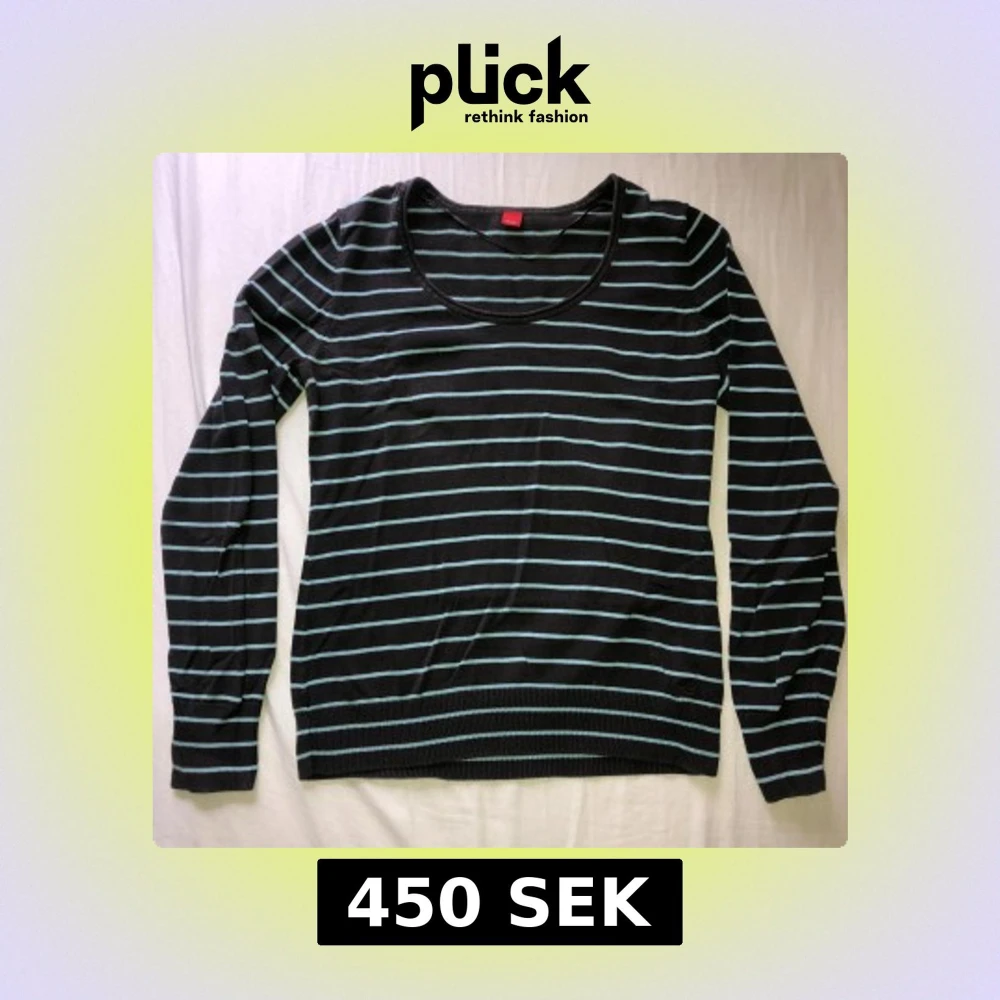 Säljer en långärmad tröja från Esprit med tunna ljusblå ränder. Tröjan har rund halsringning och är i ett mjukt, stickat material. Tror den e strolek m.