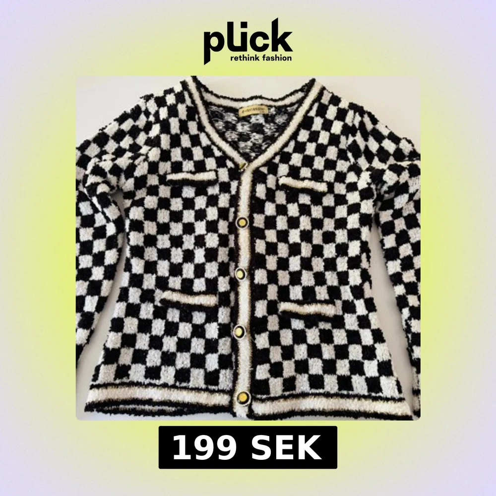 Säljer en fluffig kofta från e-woman med svartvitt rutigt mönster, guldiga detaljer och knappar framtill. Koftan har fyra fickor och v-ringad hals. Perfekt för dig som vill sticka ut med en cool och trendig look.