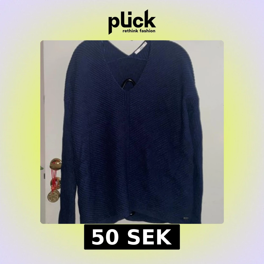Säljer en snygg mörkblå stickad tröja från e.d.c. med v-ringning. Tröjan har en ribbad struktur och långa ärmar, perfekt för kyligare dagar. Passar bra till både jeans och kjol.