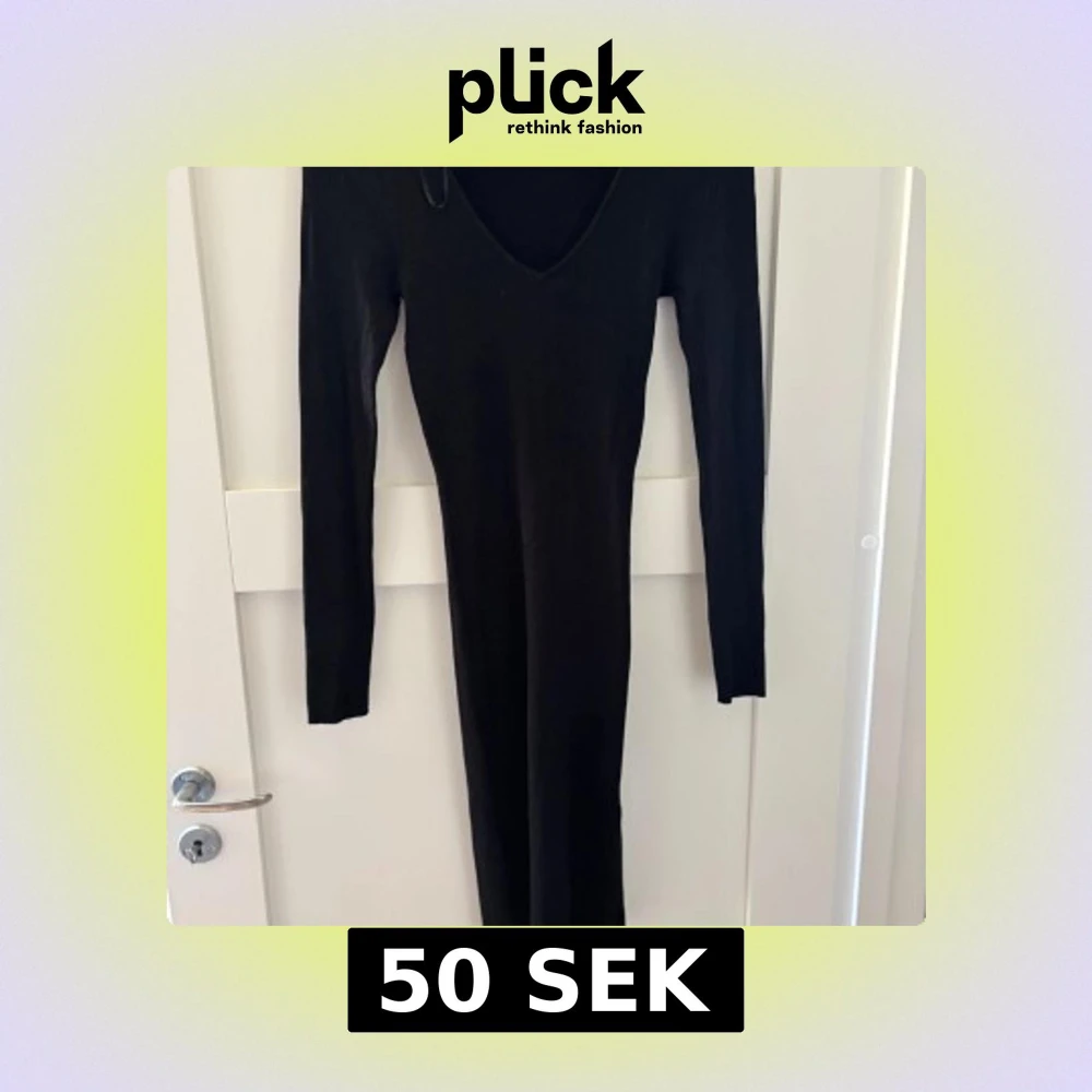 Svart långklänning med ribbad struktur och v-ringning. Klänningen har lång ärm och är figurnära i modellen, perfekt för dig som gillar en stilren och enkel look. Materialet är stickat och stretchigt för en bekväm passform.